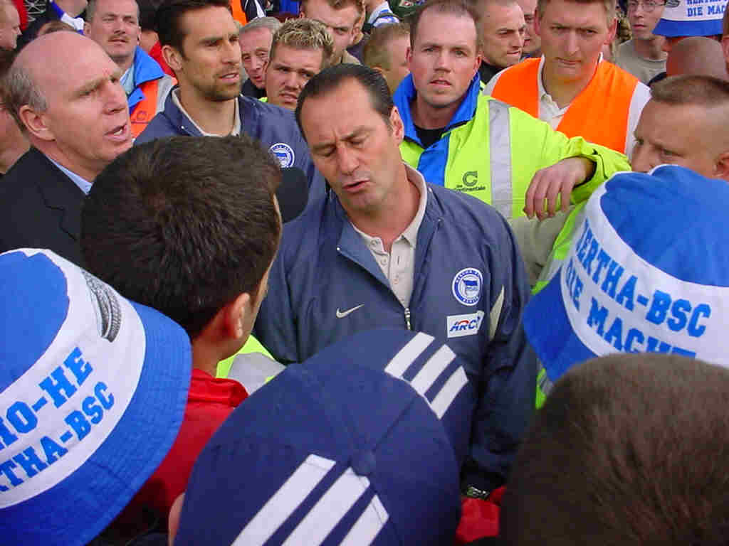 Diskussionen von Manager Hoeneß, Kapitän Preetz und Trainer Stevens nach der