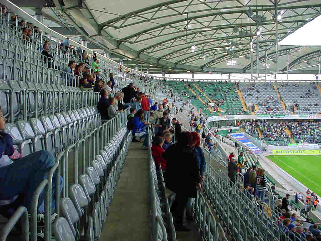 Haupttribüne der Volkwagen-Arena mit der imposanten Glasfassade. |